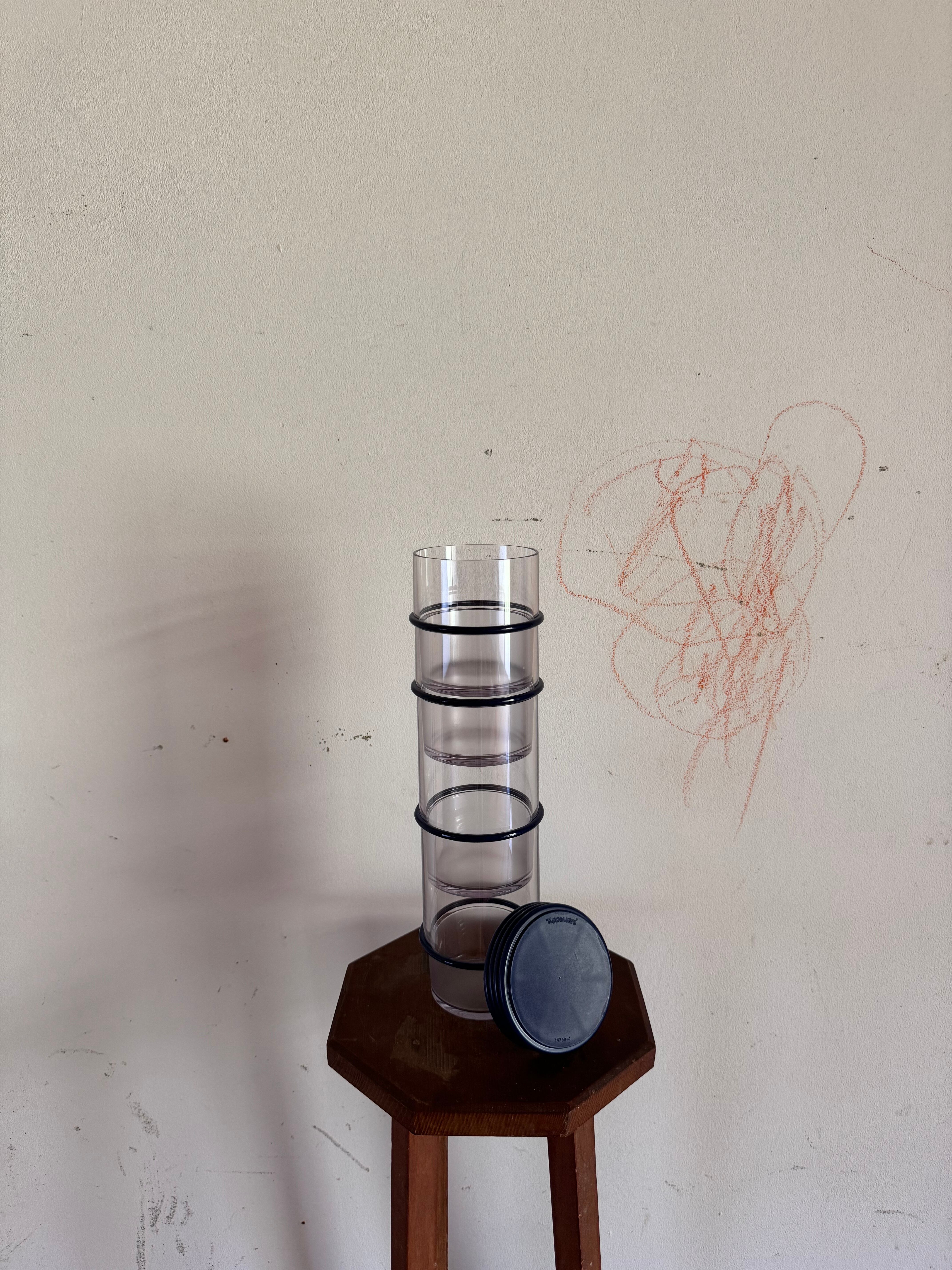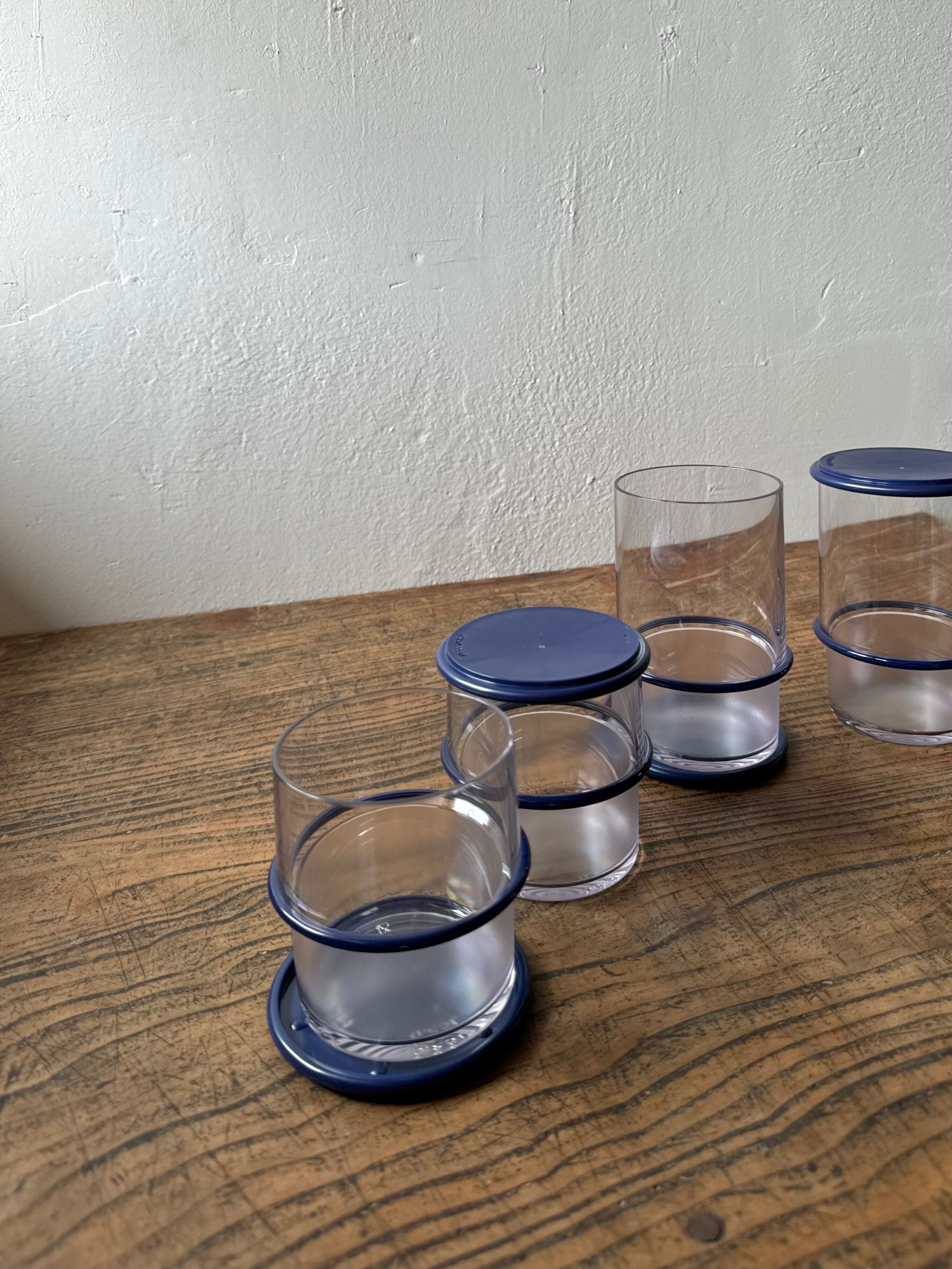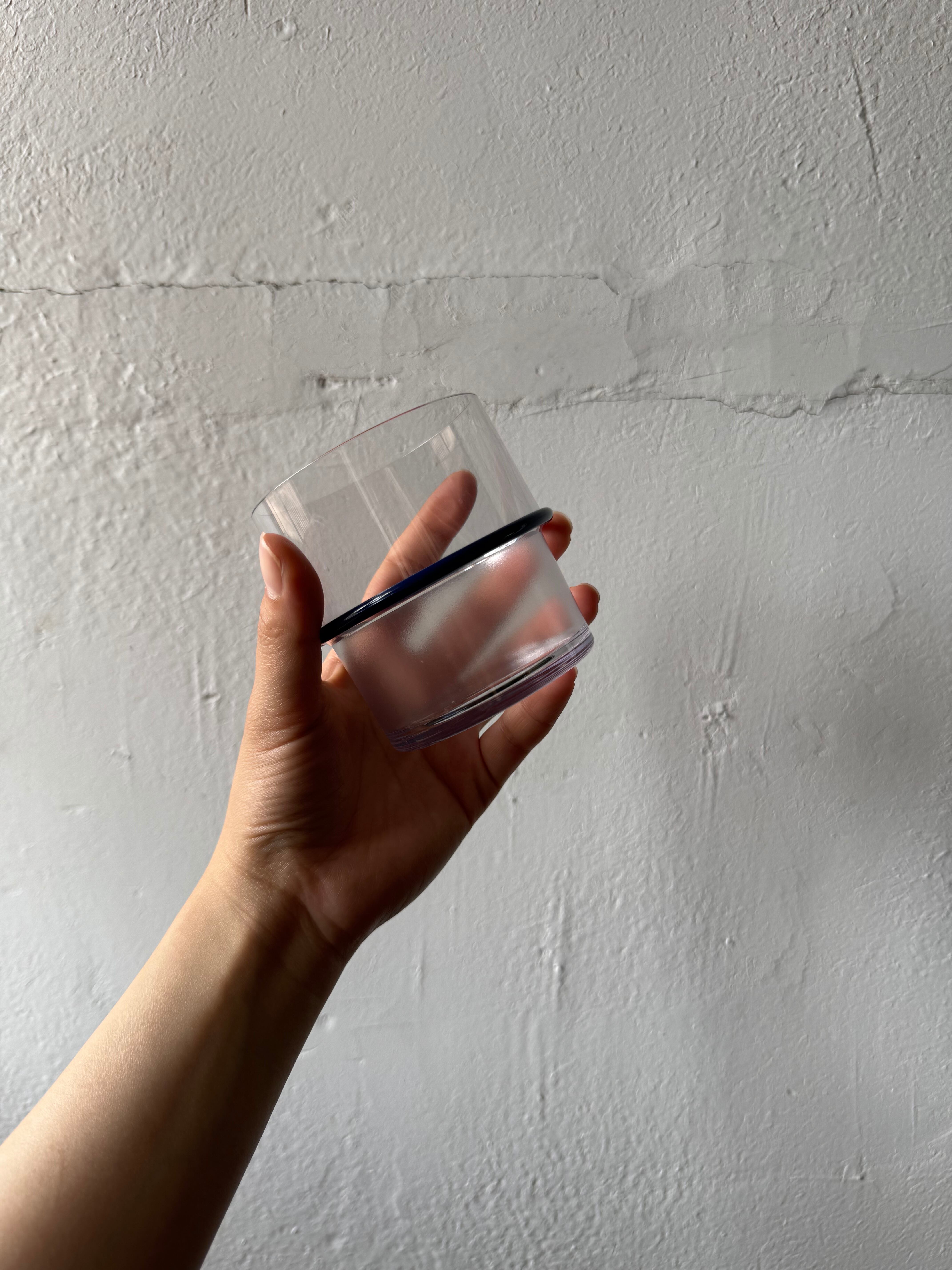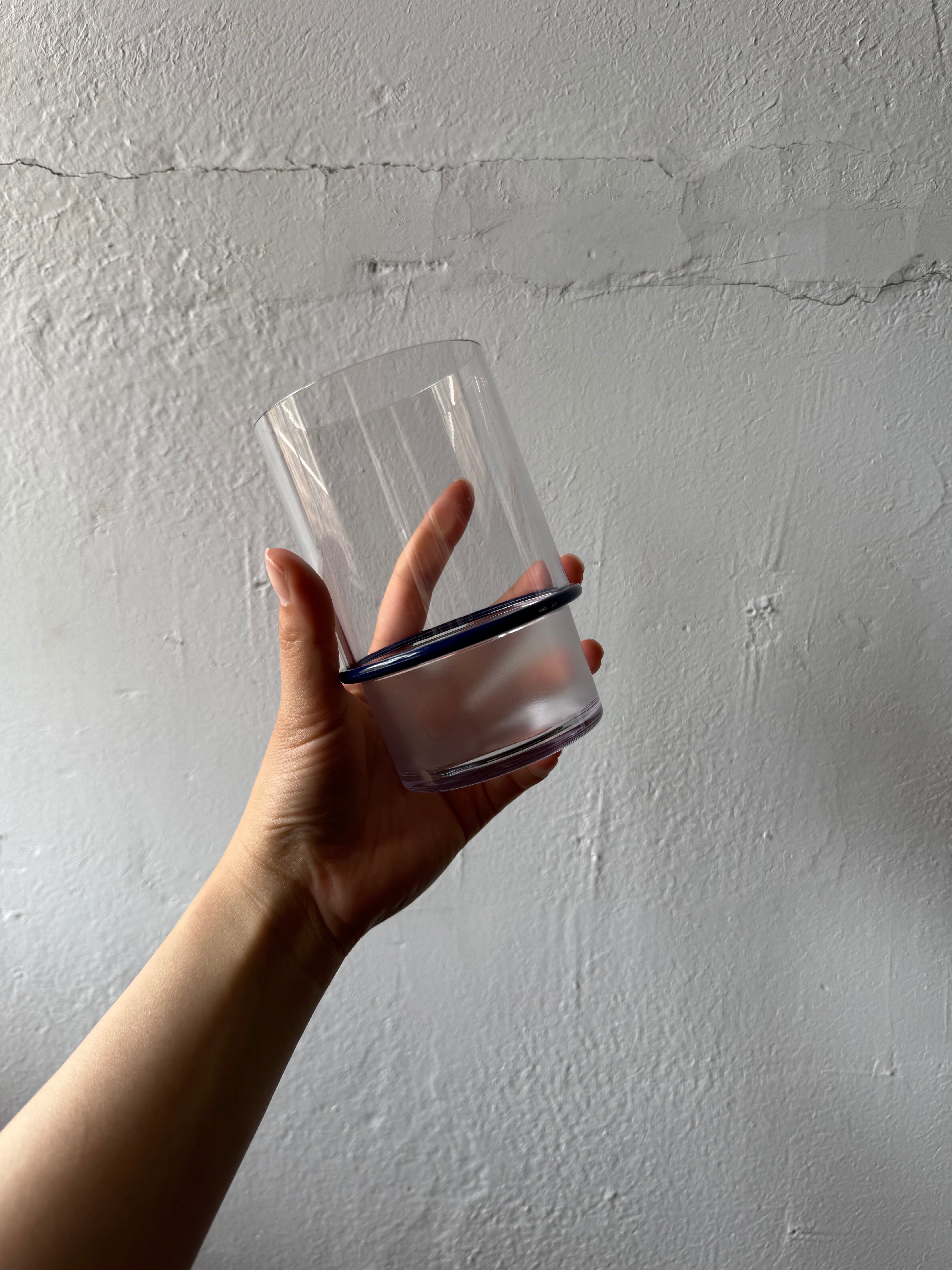 カップの上下が透明と曇り加工で切り替わるデザイン、紺色、輪っかのデザイン、、