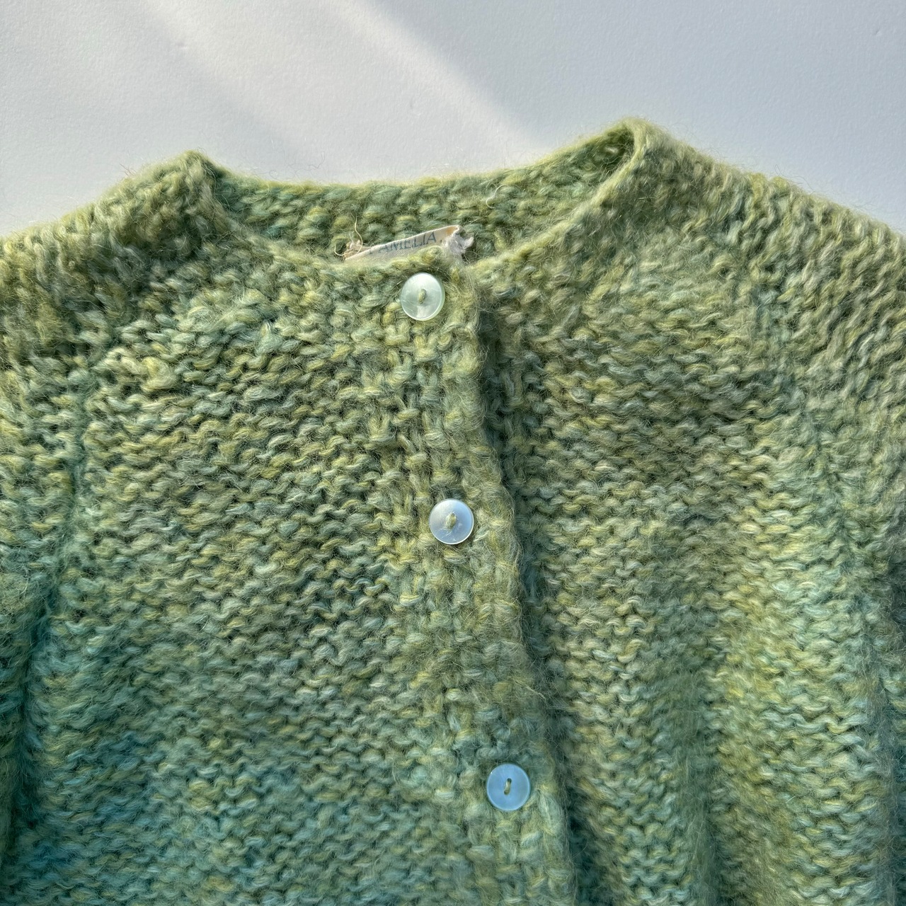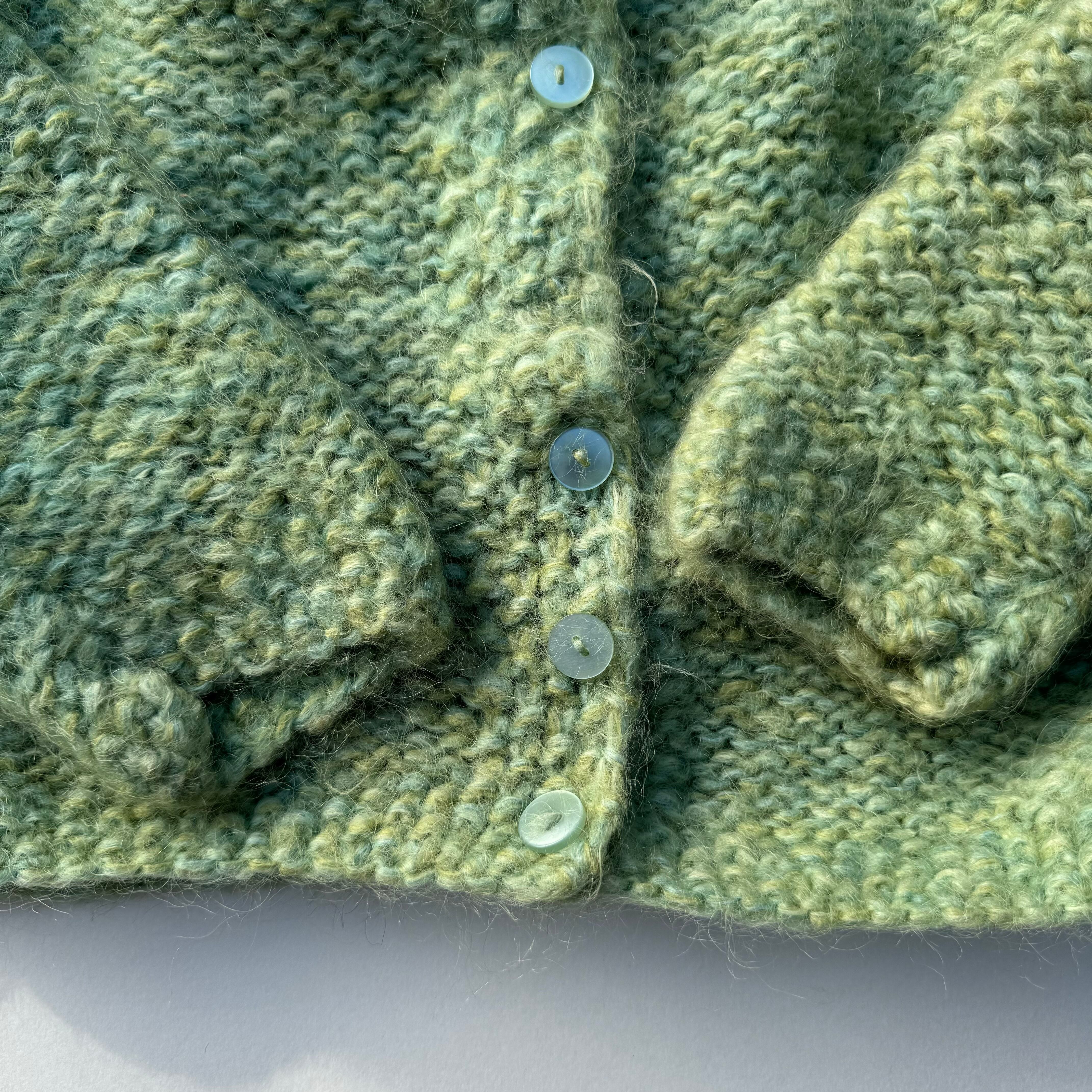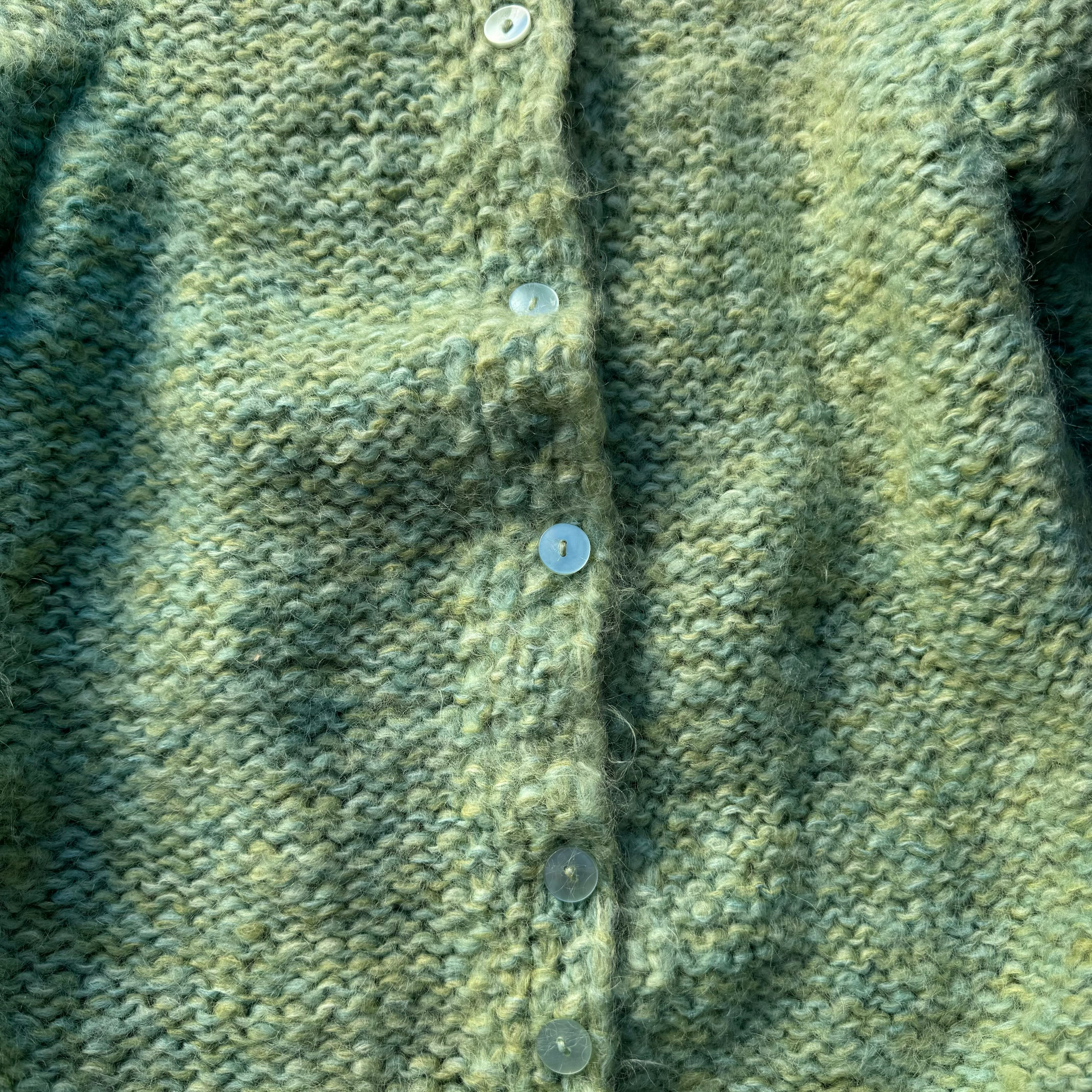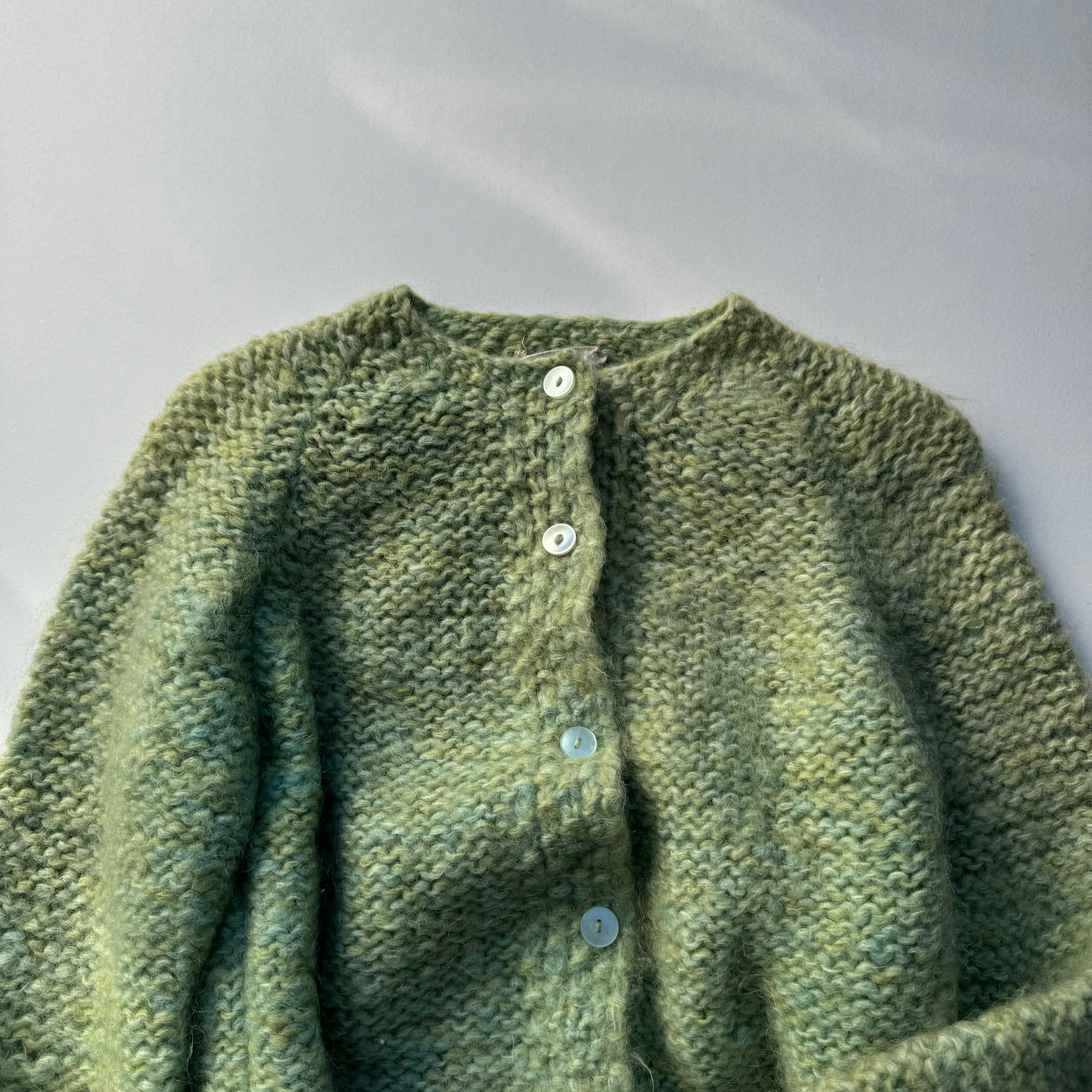 ハンドメイドのクルーネックカーディガン。