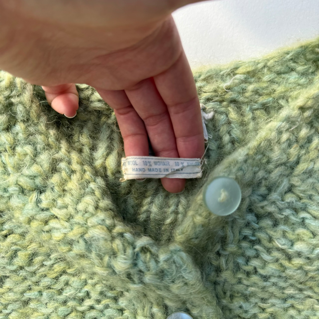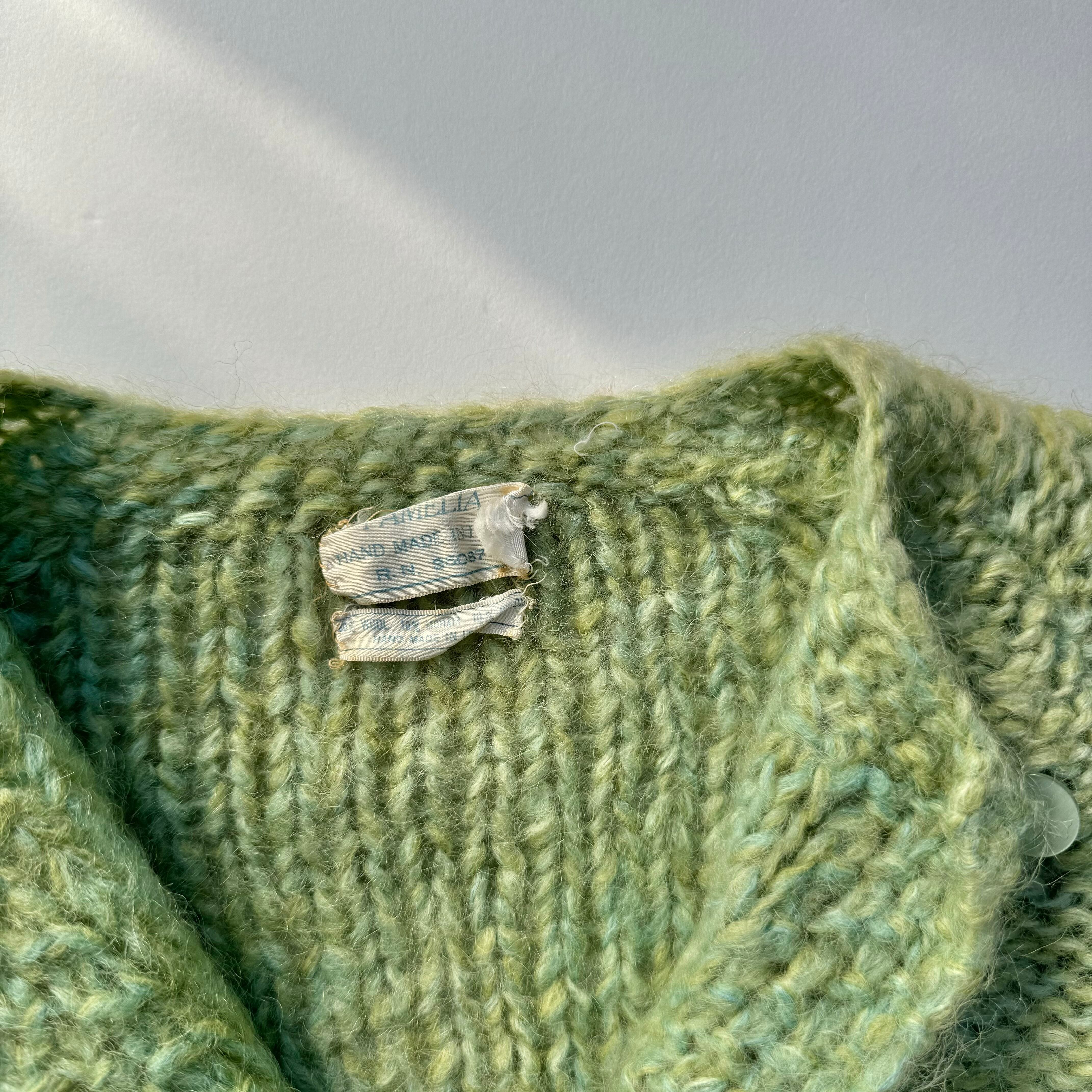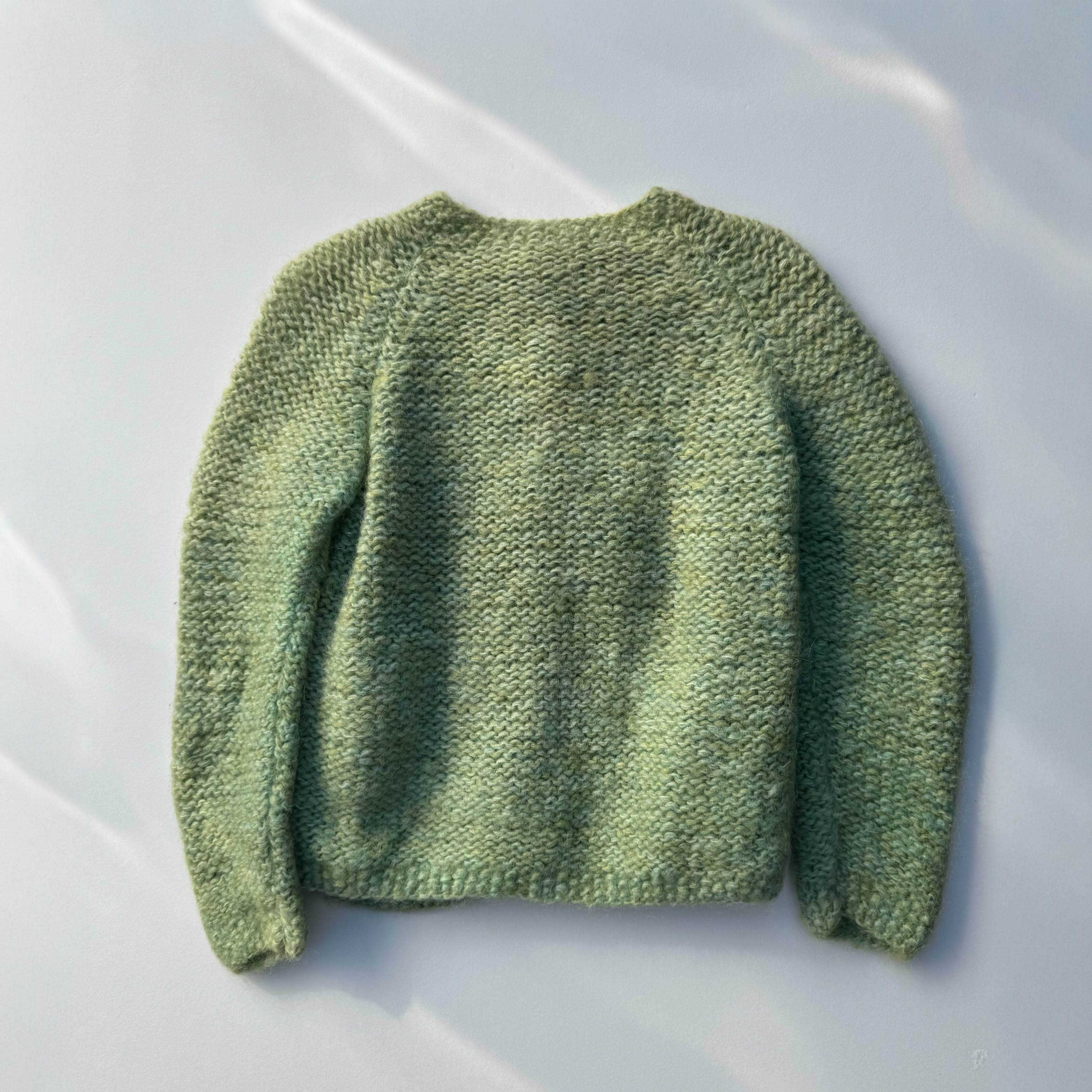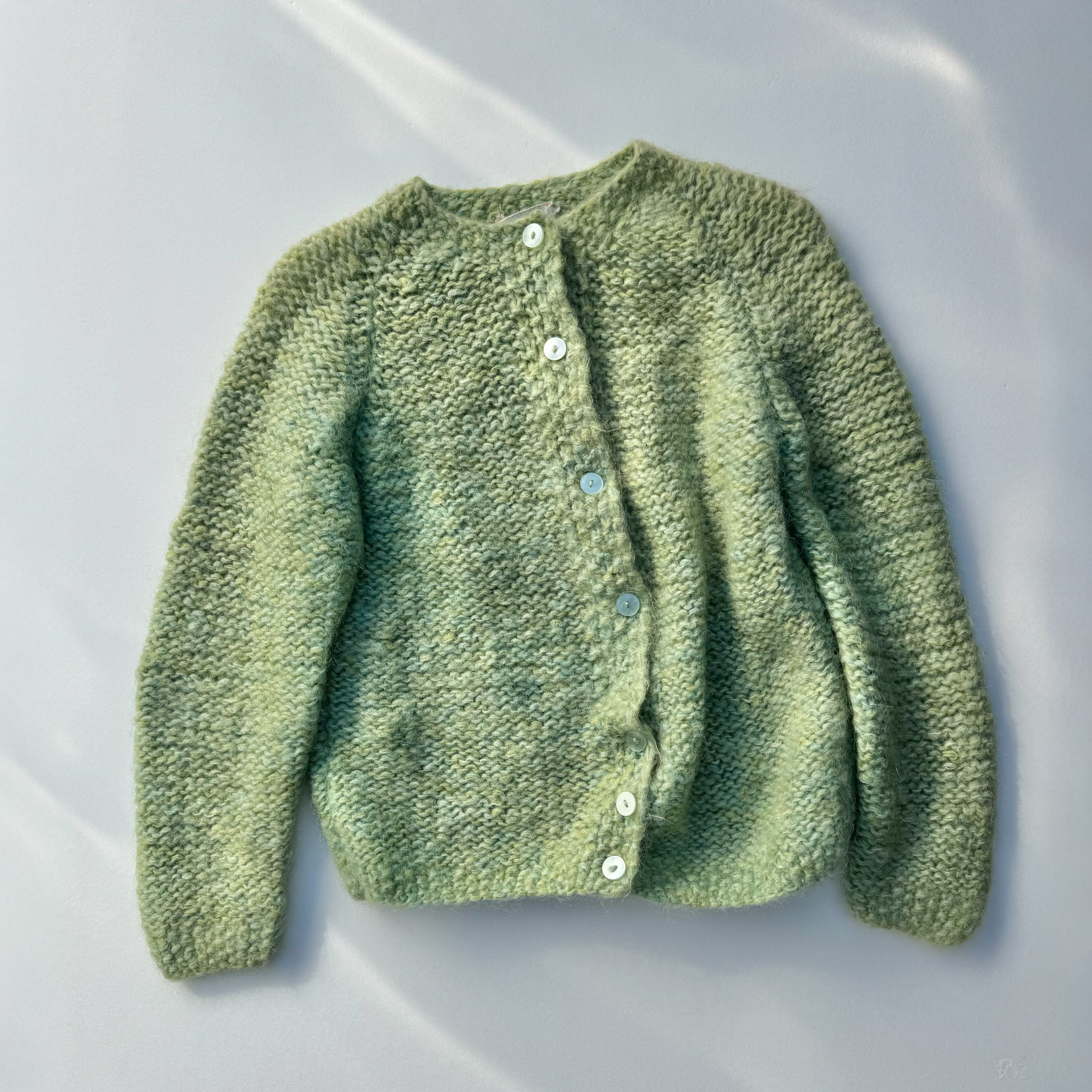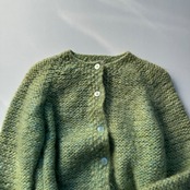 ハンドメイドのクルーネックカーディガン。
